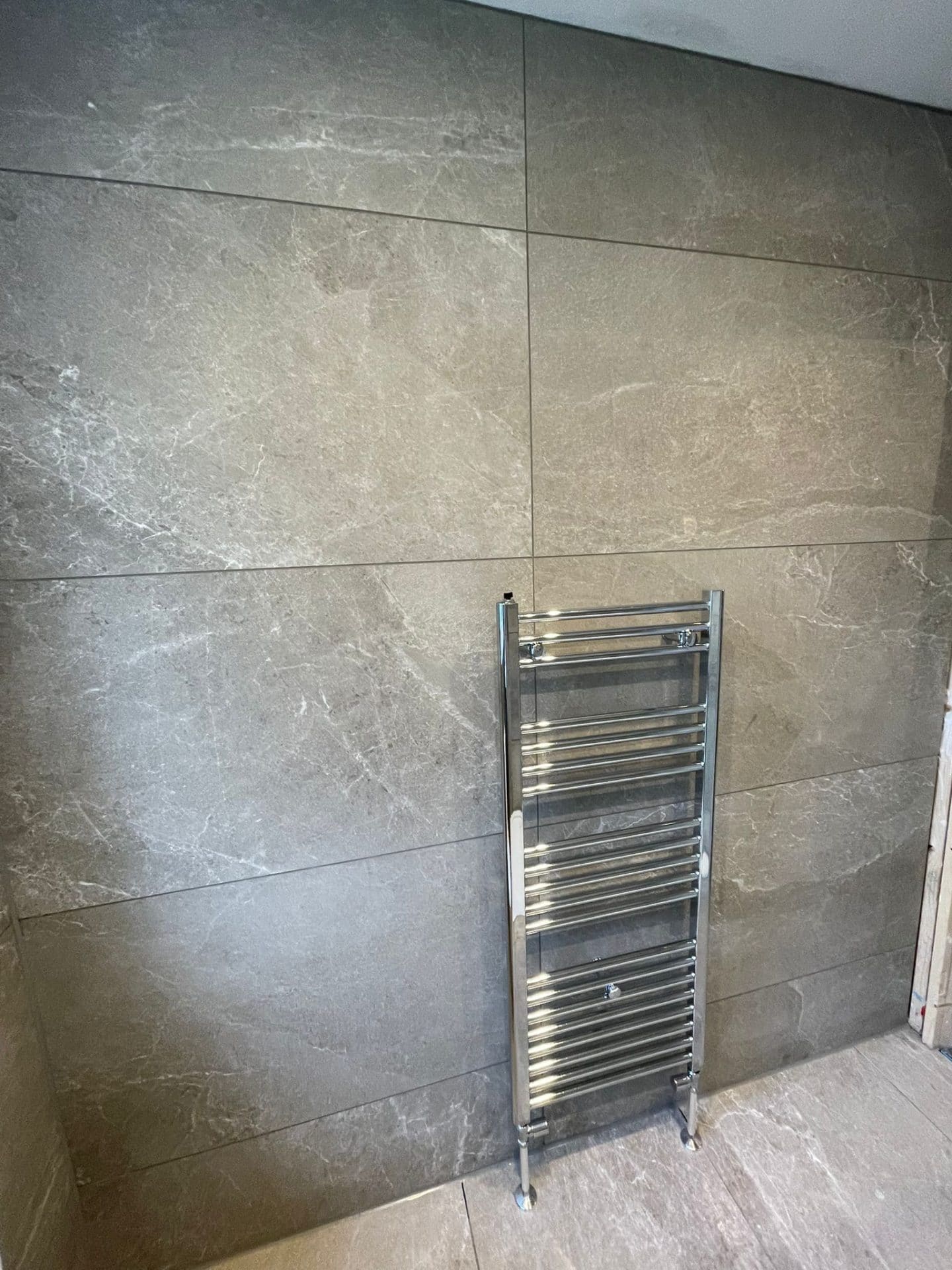 We installed a fully concealed shower system with wall-mounted shower heads, giving the space a minimalist look while keeping everything highly functional. To complement this, large-format 1200mm x 600mm tiles were fitted across both the walls and floor. The oversized tiles reduce grout lines, making the room feel bigger, cleaner, and more seamless — exactly the kind of luxury look the client wanted.